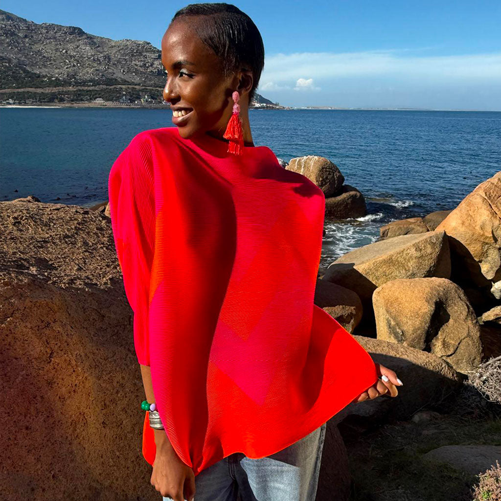 Make a statement in this vibrant lightweight jumper, showcasing a striking pink and orange zig-zag design. Crafted in a beautifully textured crinkle fabric, it features a softly structured high neckline and elegant dolman sleeves, creating a relaxed silhouette that drapes effortlessly. Perfect for travel and everyday use, this low-maintenance piece can be washed, hung to dry, and worn straight away—no ironing required. Bold yet versatile, it works just as well worn solo as it does layered over a longline T-shirt or fine knit. Pair with tailored trousers for a polished look or dress down with denim for a chic off-duty style.