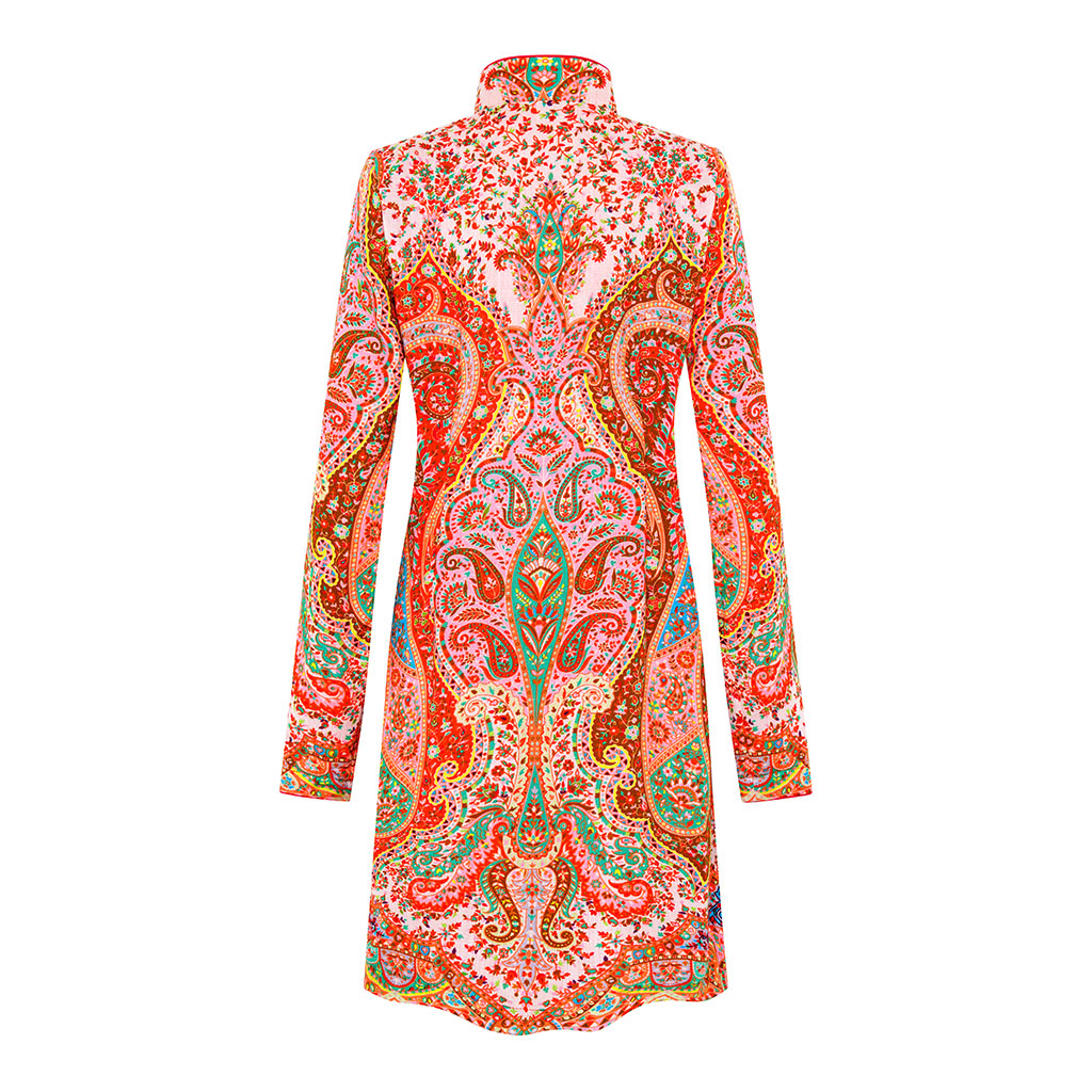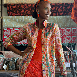 A celebration of bold colour and exquisite design, the Carnival Paisley Shawl Jacket is a striking addition to any wardrobe. In the same style as our best-selling Selena, this jacket is made from a luxurious blend of silk and viscose in a vibrant paisley inspired print with a stylish straight cut and deep side slits. The high stand-up collar and structured front button closure create a refined, contemporary feel, while the intricate pattern-work in shades of red, orange, turquoise, and green adds a touch of playful sophistication. This statement piece transitions seamlessly from daytime chic to evening glamour. Wear it over a sleek dress or tailored trousers for a truly unforgettable look.